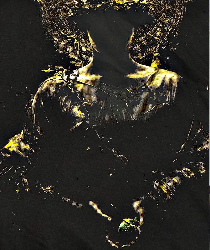 LUCIDEZ Enquanto o mundo espera o fruto vermelho, previsível, A verlith escolheu o verde , que simboliza consciência em nascimento — escolha antes do impulso. -A estampa integra luz e sombra como partes do mesmo processo. O fruto verde não fala de imaturidade, mas de ruptura com o automático. Ele é o símbolo do não óbvio — de quem vê antes, sente antes e age com intenção. -