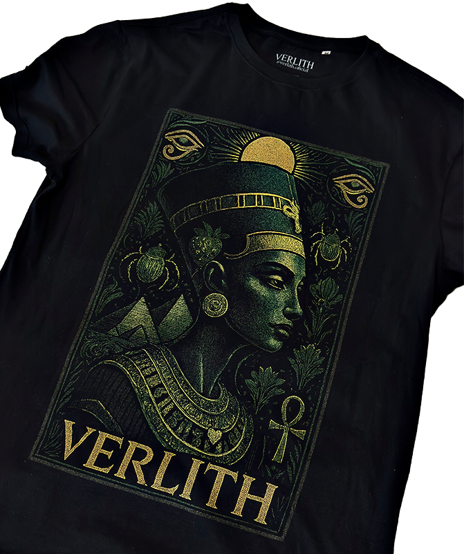 NEFERTITI simboliza a força de sustentar uma visão até o fim. Mesmo sem aprovação. Mesmo sem aplausos. Mesmo quando ninguém está olhando. Guardou a revolução, preservou a identidade e permaneceu firme quando o mundo recuou. Não buscou validação — sustentou consciência. O verde profundo representa a vida que continua, a consciência já integrada, a identidade que não se dobra ao óbvio. Esta estampa é para quem escolhe permanecer fiel ao que é, mesmo em silêncio. Mesmo sozinho.